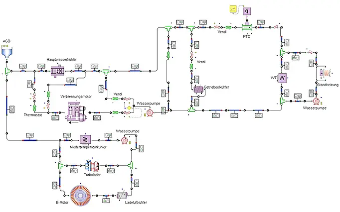 Based on 3D CAD data or hydraulic-thermal functional diagrams, we model complete cooling circuits, including pressure losses, mass flows, temperature curves and energy flows. This enables well-founded decisions to be made when designing, dimensioning and optimizing thermal systems - e.g. in vehicles, power electronics or mechanical engineering.